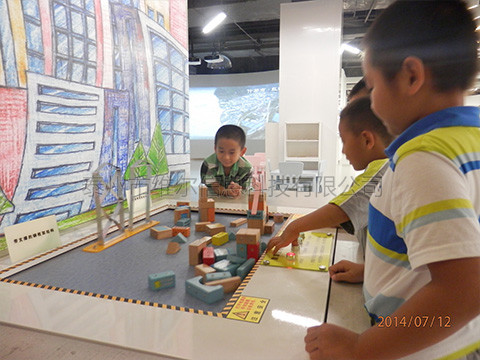 抗震及普通的建筑模型 地震演示臺(tái)上有3個(gè)按鈕,分別代表3個(gè)不同的地震的震級(jí)。地震波由地震起動(dòng)設(shè)備提供,當(dāng)按動(dòng)某一個(gè)震級(jí)的按鈕時(shí),演示臺(tái)就會(huì)按照該震級(jí)的震動(dòng)幅度震動(dòng)。對(duì)震動(dòng)臺(tái)上的物體產(chǎn)生相應(yīng)的破壞。 觀眾自行搭建房屋積木,完成后選擇地震等級(jí)按鈕,不同地震等級(jí)按鈕有不同震動(dòng)強(qiáng)度。磚混結(jié)構(gòu)、框架結(jié)構(gòu)房屋、普通砌體抗震效果得以體現(xiàn),從而讓參與者了解三種房屋結(jié)構(gòu),哪種更抗震。