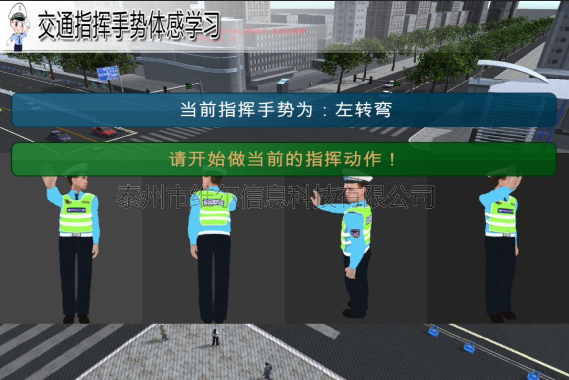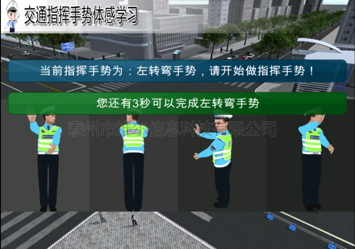 該系統(tǒng)是采用虛擬影像技術(shù),加入即時(shí)摳像功能,實(shí)現(xiàn)交通警察手勢(shì)指揮交通的全息展示。顯示屏直立入口處,畫面顯示穿著制服的交通警察,無(wú)人走過時(shí),畫面為交通警察面帶微笑靜止不動(dòng),當(dāng)有人走過或靠近時(shí),交通警察會(huì)根據(jù)紅綠燈信息做相應(yīng)手勢(shì)指揮交通。 交警指揮手勢(shì)模擬游戲 游戲開始時(shí),畫面上卡通交警依次顯示做指揮手勢(shì)的畫面,分別是:左轉(zhuǎn)彎、停止、左轉(zhuǎn)彎等待、右轉(zhuǎn)彎等待、右轉(zhuǎn)彎、變道、減速、靠邊停車、直線,同時(shí)會(huì)有相應(yīng)語(yǔ)音提示。體驗(yàn)者在感應(yīng)區(qū)域中模擬交警的手勢(shì),同時(shí)程序會(huì)通過kinect去識(shí)別,在規(guī)定的時(shí)間內(nèi)依次完成模擬進(jìn)行手勢(shì)學(xué)習(xí),最后系統(tǒng)給出評(píng)分。每一輪游戲結(jié)束間隔5秒后,系統(tǒng)會(huì)自動(dòng)開始下一輪游戲。